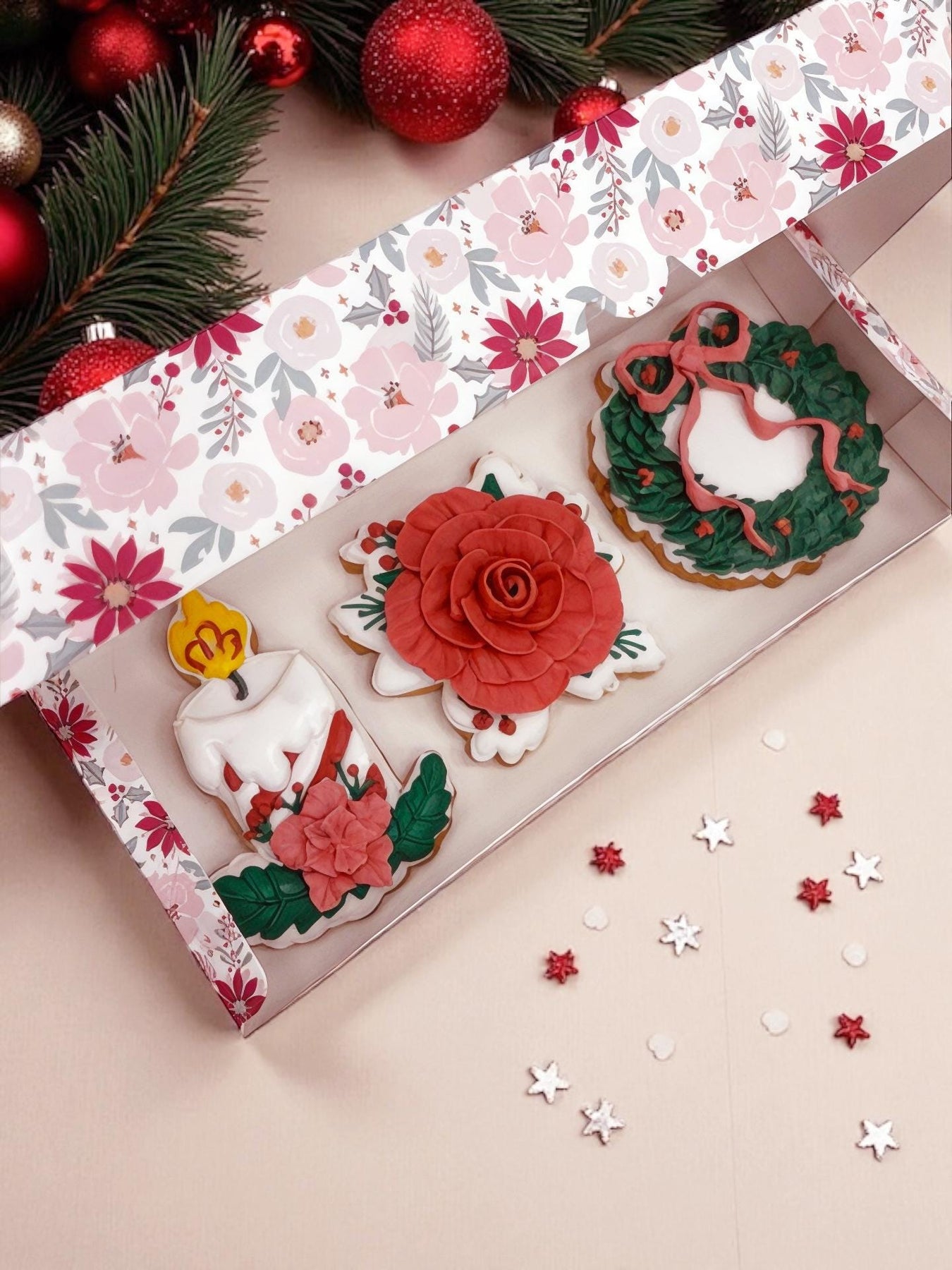 This 3 piece set will fit in a 12" x 5" box, you can purchase this floral box set from our website: https://thecookiery.ca/collections/cookie-couture-boxes/products/holiday-florals-box-12x5x1-5-by-cookie-couture-copy